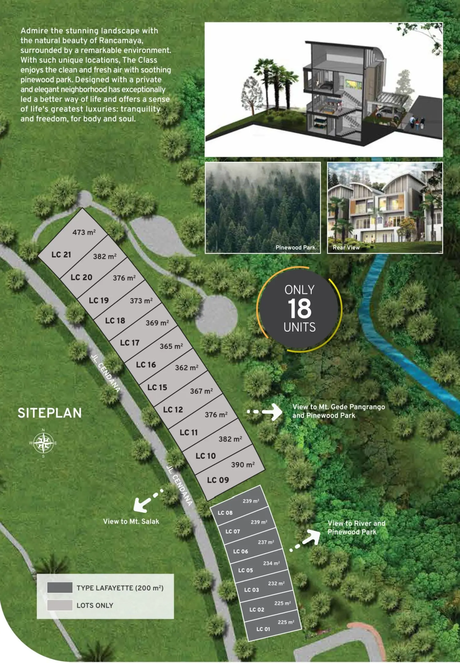 The Class merupakan hunian rumah ekslusif berkelas di kota Bogor yang telah dikembangkan oleh Rancamaya Golf Estate. Berada di klaster paling depan dengan hanya 18 unit saja, yang terbagi atas pilihan kavling dan rumah. Desainnya yang modern, dikelilingi pepohonan, lembah hijau dan sungai di belakang rumah membuat hunian di klaster The Class terasa begitu nyaman. Luas kavling dijual mulai 360 m2, dan tipe rumah Lafayette dengan luas bangunan 200 m2, 3 lantai, dan 3+1 kamar tidur.